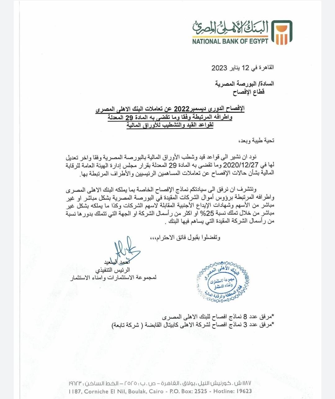 وأشار البيان أن البنك الأهلى المصرى وأطرافه المرتبطة برؤوس أموال الشركات المقيدة في البورصة المصرية يمتلك بشكل مباشر أو غير مباشر من الأسهم وشهادات الإيداع الأجنبية المقابلة لأسهم الشركات وكذا ما يملكه بشكل غير مباشر من خلال تملك نسبة 25% أو أكثر من رأسمال الشركة او الجهة التي تتملك بدورها نسبة من رأسمال الشركة المقيدة التي يساهم فيها البنك.