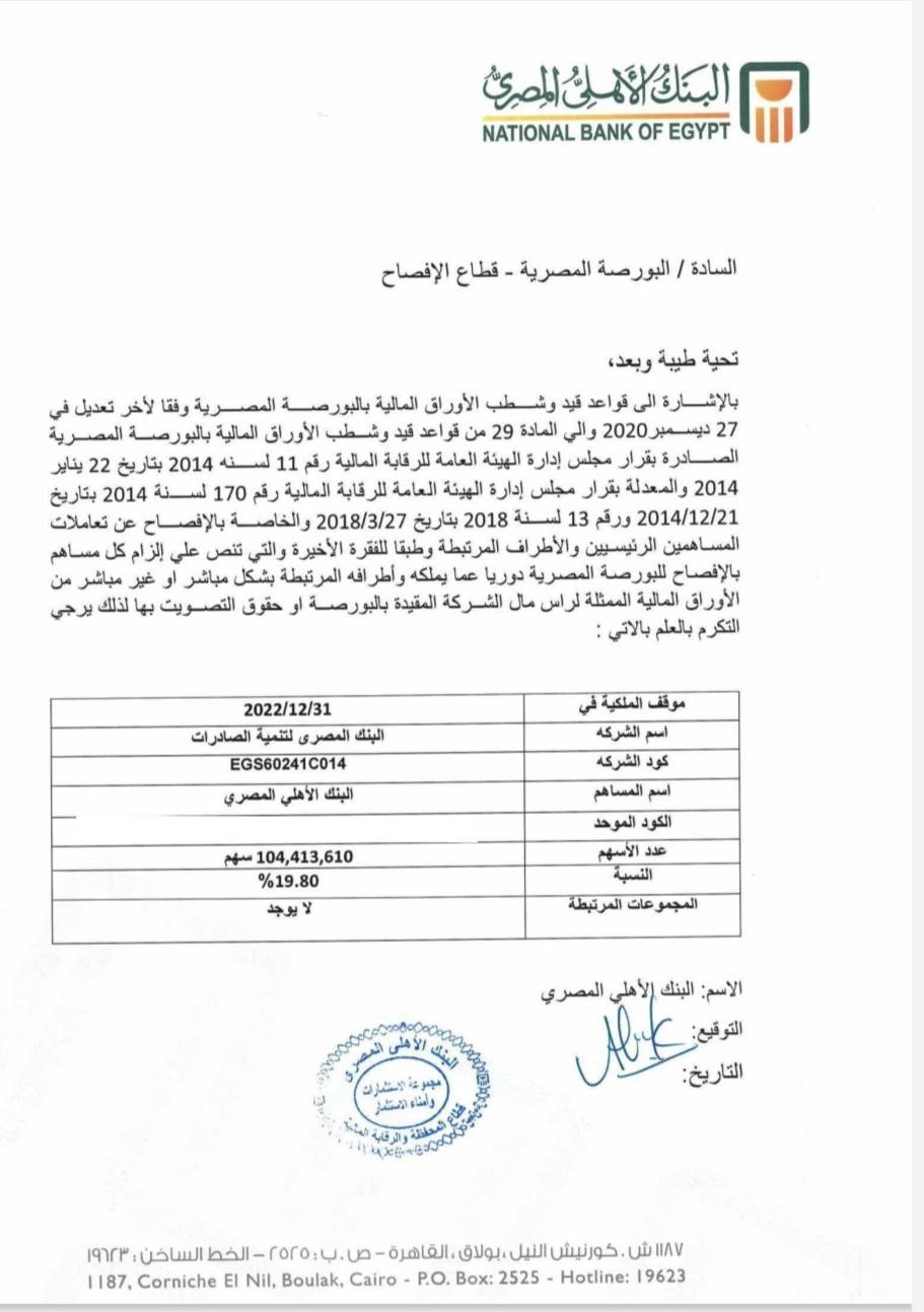البنك الأهلي المصري يمتلك 19.80% من أسهم «المصري لتنمية الصادرات»