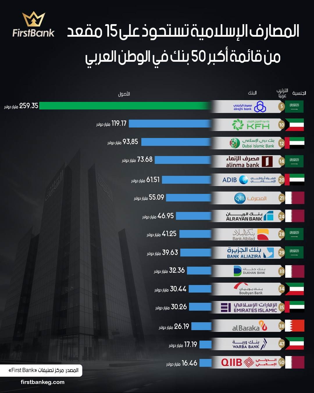 أصدر «First Bank» مؤخرًا تصنيفًا لأكبر 50 بنكًا في الوطن العربي، وجاءت نتائجه لتعكس حضورًا قويًا للمصارف الإسلامية، حيث ضمت القائمة 15 مصرف إسلامي ضمن أكبر الكيانات المصرفية من حيث حجم الأصول.