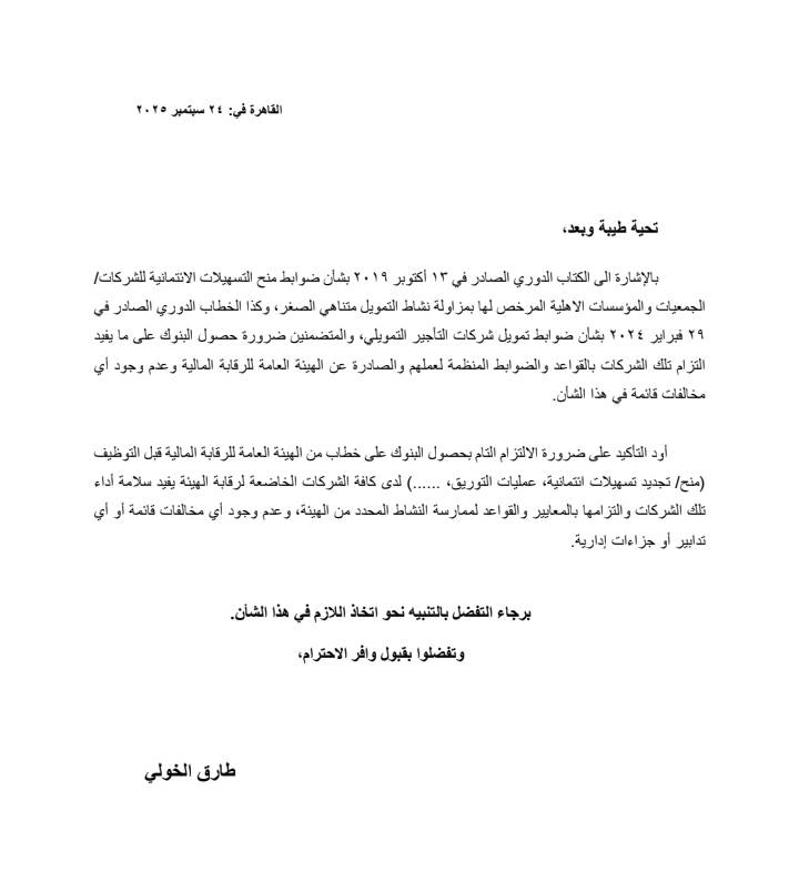 وجاء نص البيان كالتالي: بالإشارة إلى الكتاب الدوري الصادر في 13 أكتوبر 2019 بشأن ضوابط منح التسهيلات الائتمانية للشركات الجمعيات والمؤسسات الأهلية المرخص لها بمزاولة نشاط التمويل متناهي الصغر، وكذا الخطاب الدوري الصادر في 29 فبراير 2027 بشأن ضوابط تمويل شركات التأجير التمويلي والمتضمنين ضرورة حصول البنوك على ما يفيد التزام تلك الشركات بالقواعد والضوابط المنظمة لعملهم والصادرة عن الهيئة العامة للرقابة المالية وعدم وجود أي مخالفات قائمة في هذا الشأن.
