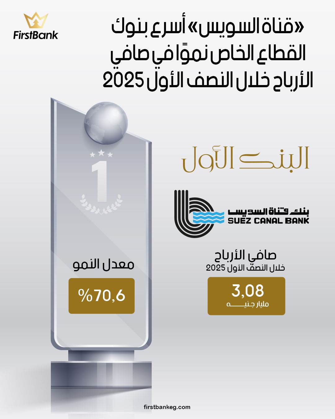 ودفع هذا الأداء القوي للبنك إلى تصدره قائمة «First Bank» لبنوك القطاع الخاص العاملة في الجهاز المصرفي المصري الأسرع نموًا في صافي الأرباح خلال النصف الأول من 2025.