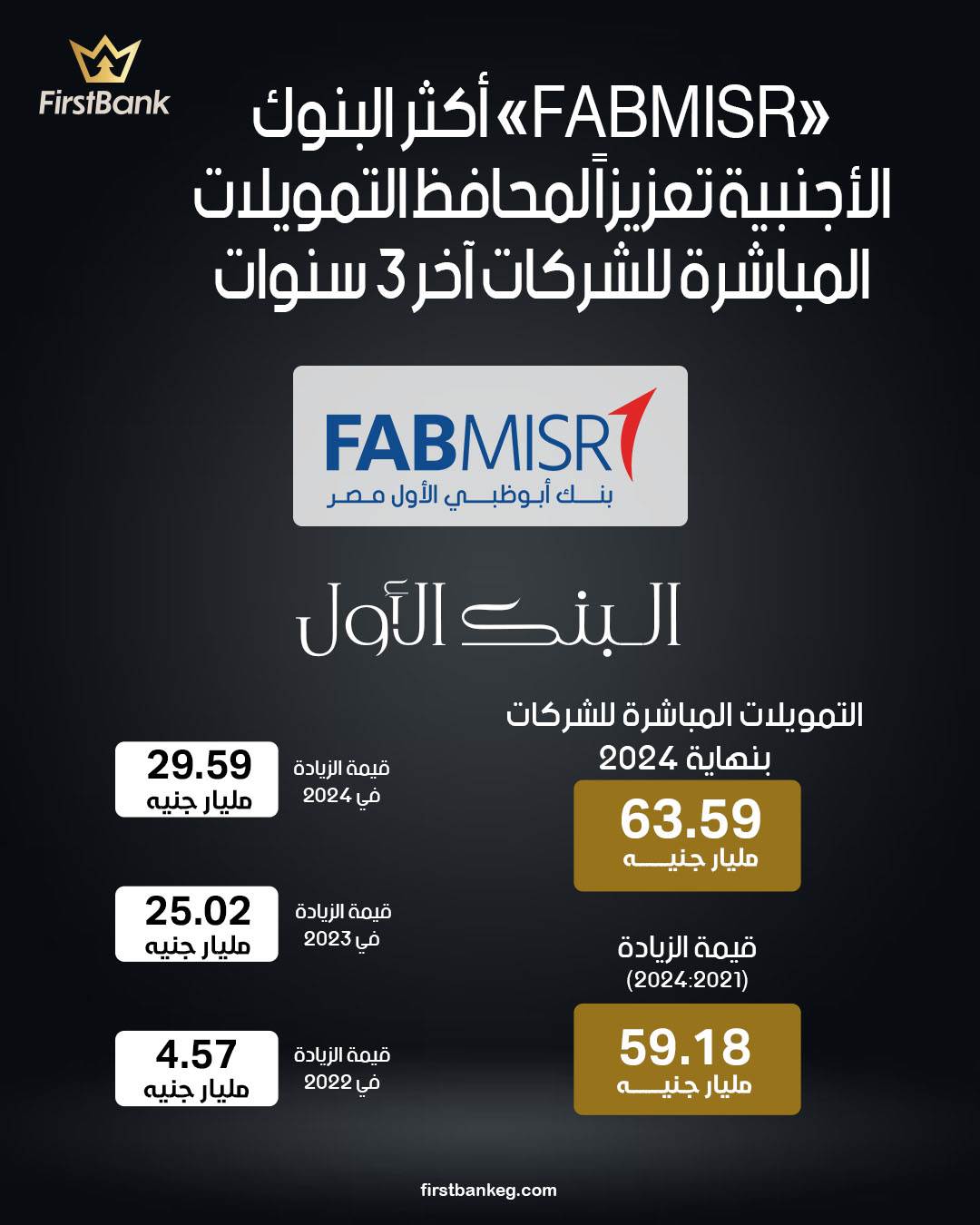 البنك الأول: «FABMISR» أكثر البنوك الأجنبية تعزيزاً لمحافظ التمويلات المباشرة للشركات آخر 3 سنوات
