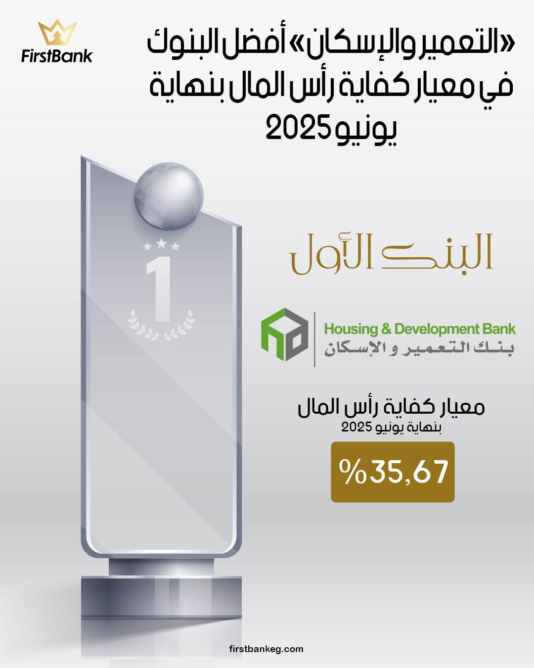 تصدر بنك التعمير والإسكان قائمة «First Bank» لأفضل البنوك في معيار كفاية رأس المال بنهاية يونيو 2025، بعدما سجل معيار كفاية رأس المال لديه 35.67%، مما يعكس مدى قدرته القوية على مقابلة إلتزاماته ومواجهة أى خسائر قد تحدث في المستقبل.