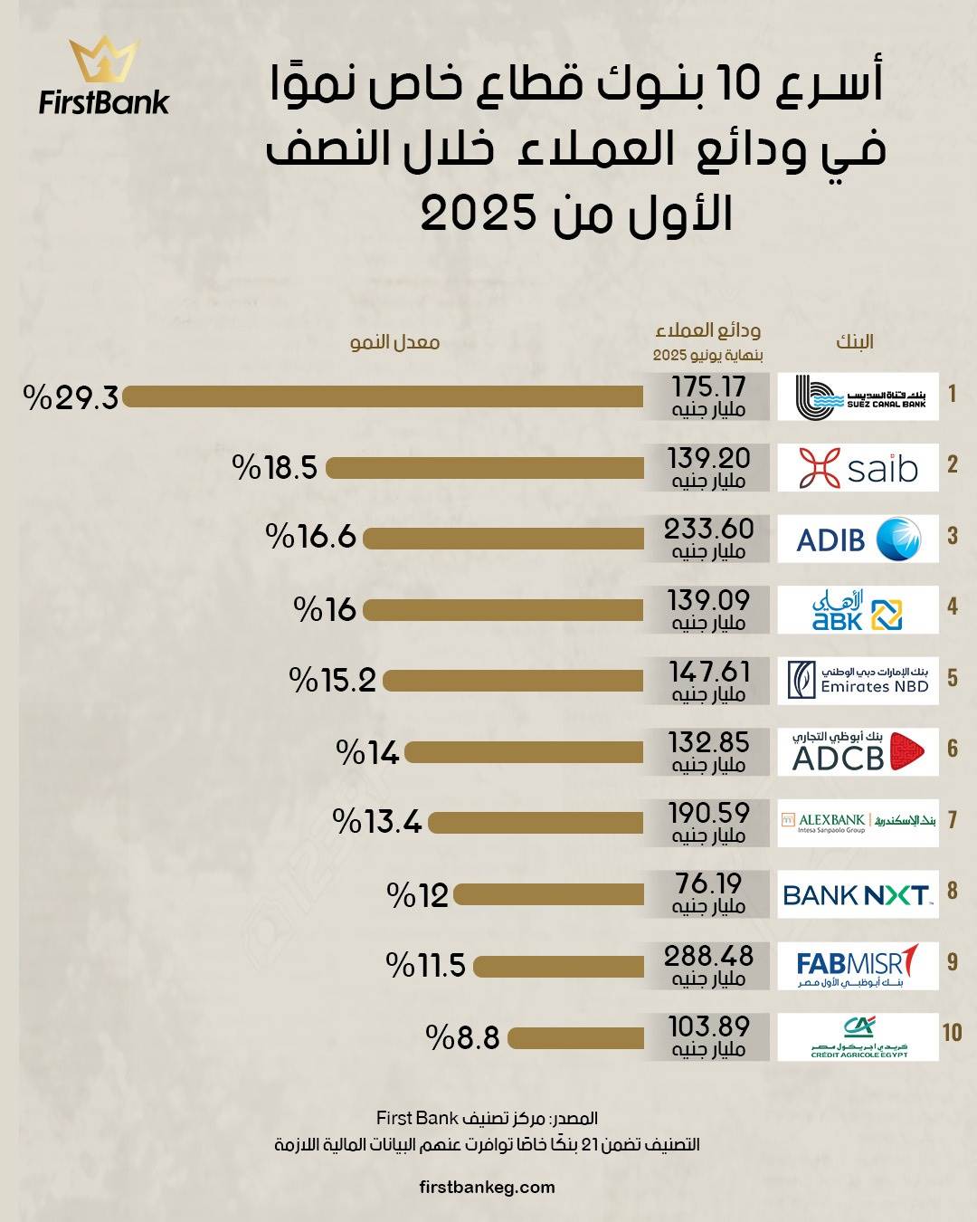 38648 /38648 أسرع 10 بنوك قطاع خاص نموًا في ودائع العملاء خلال النصف الأول من 2025 01:49 م - الأربعاء 1 أكتوبر 2025 شارك شارك