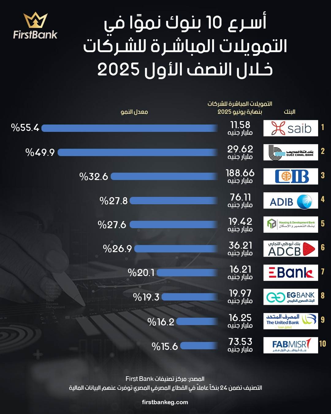 38658 /38658 أسرع 10 بنوك نموًا في التمويلات المباشرة للشركات خلال النصف الأول 2025 04:31 م - الأربعاء 1 أكتوبر 2025 شارك شارك