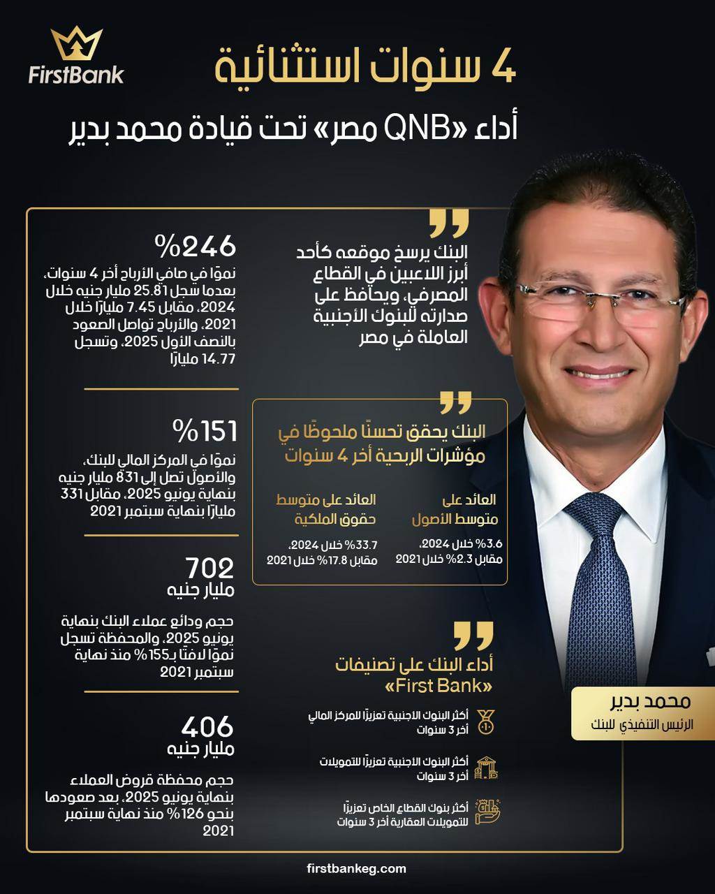 38686 /38686 4 سنوات استثنائية...أداء «QNB مصر» تحت قيادة محمد بدير ماهينار محمد 05:00 م - الثلاثاء 30 سبتمبر 2025 شارك شارك محمد بدير