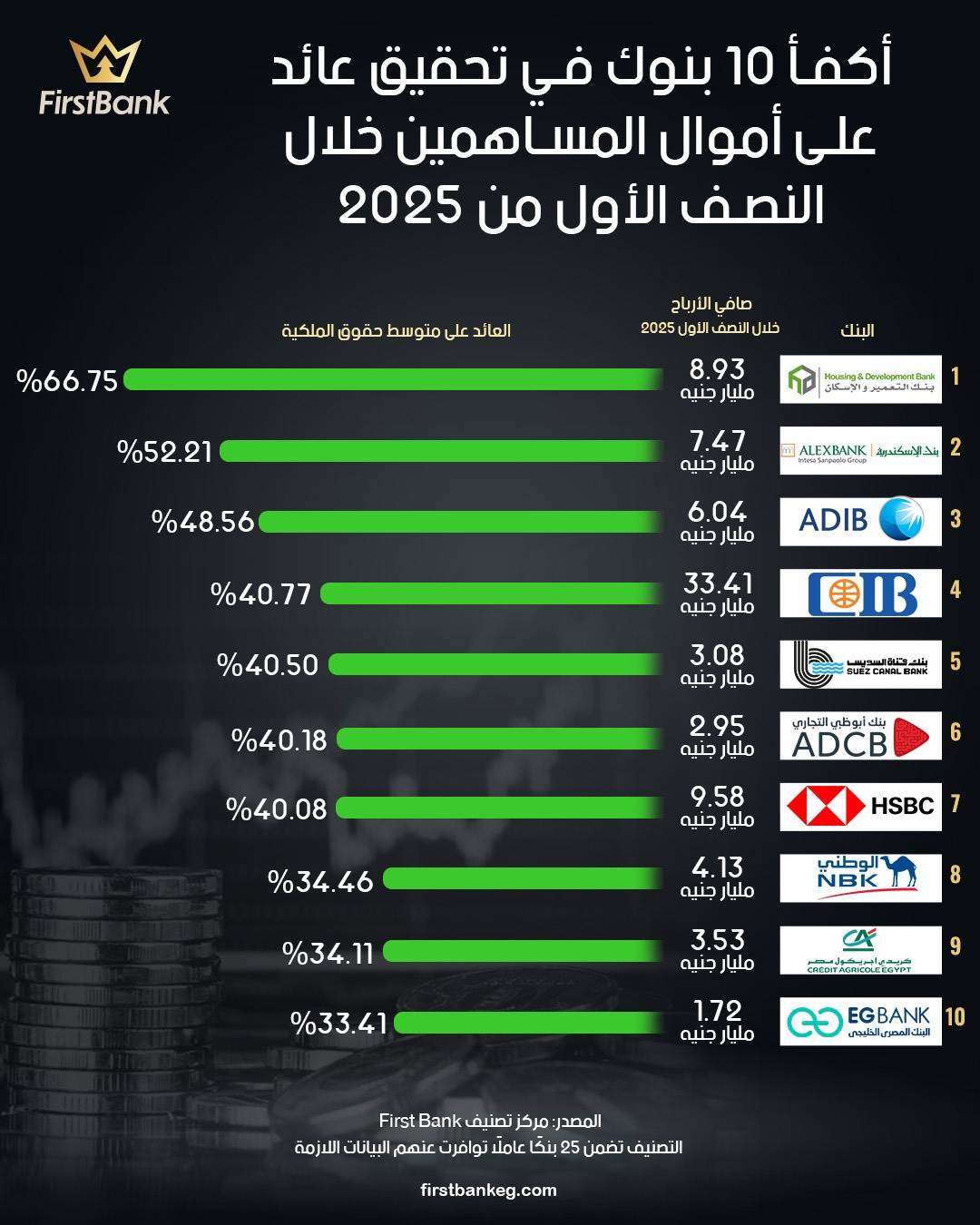 38698 /38698 أكفأ بنوك في تحقيق عائد علي أموال المساهمين خلال النصف الأول من 2025 04:52 م - الخميس 2 أكتوبر 2025 شارك شارك