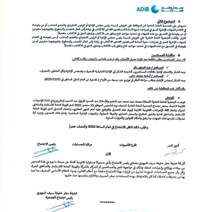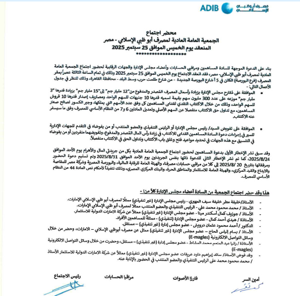 كما فوضت الجمعية العامة العادية للمصرف كلٍ من، محمد سيد عبد الحليم، وعبد الحميد فاروق «منفردين» في اتخاذ الإجراءات اللازمة لاعتماد محضر اجتماع الجمعية العامة العادية المنعقد يوم الخميس الموافق 25 سبتمبر 2025 لدى الهيئة العامة للاستثمار والمناطق الحرة.