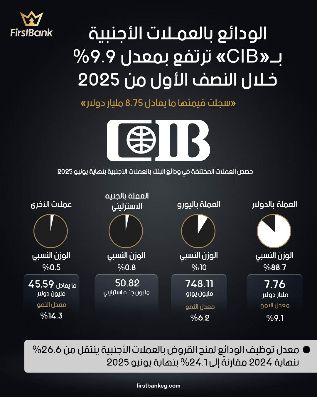 38782 /38782 الودائع بالعملات الأجنبية بـ «CIB» ترتفع بمعدل 9.9% خلال النصف الأول من 2025 First Bank 12:59 م - الإثنين 6 أكتوبر 2025 شارك شارك
