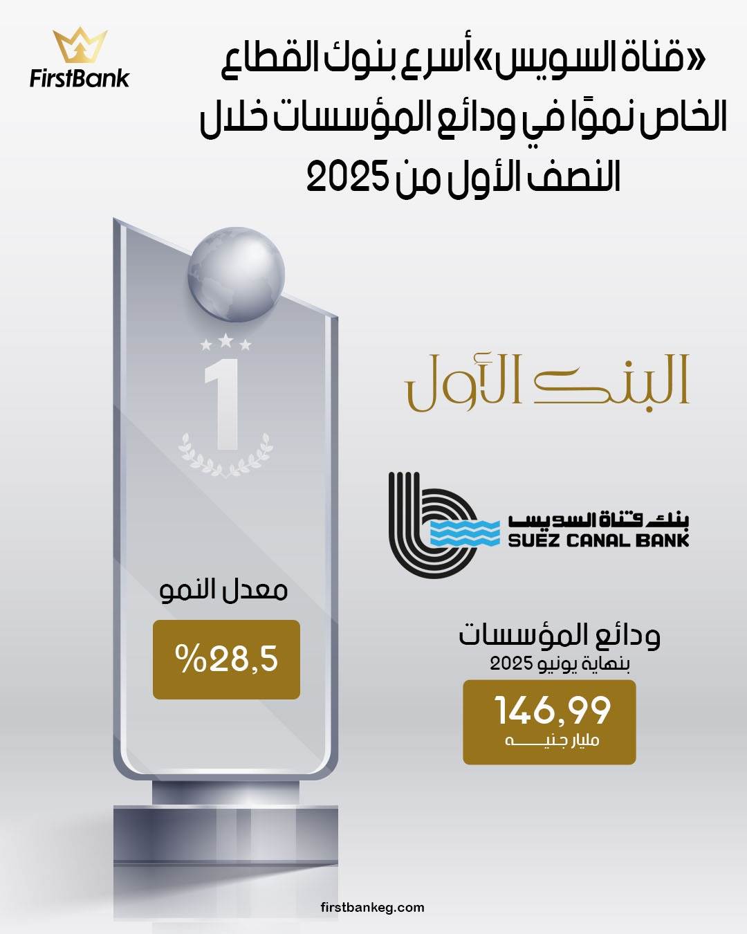 البنك الأول: «قناة السويس» أسرع بنوك القطاع الخاص نموًا في ودائع المؤسسات خلال النصف الأول من 2025