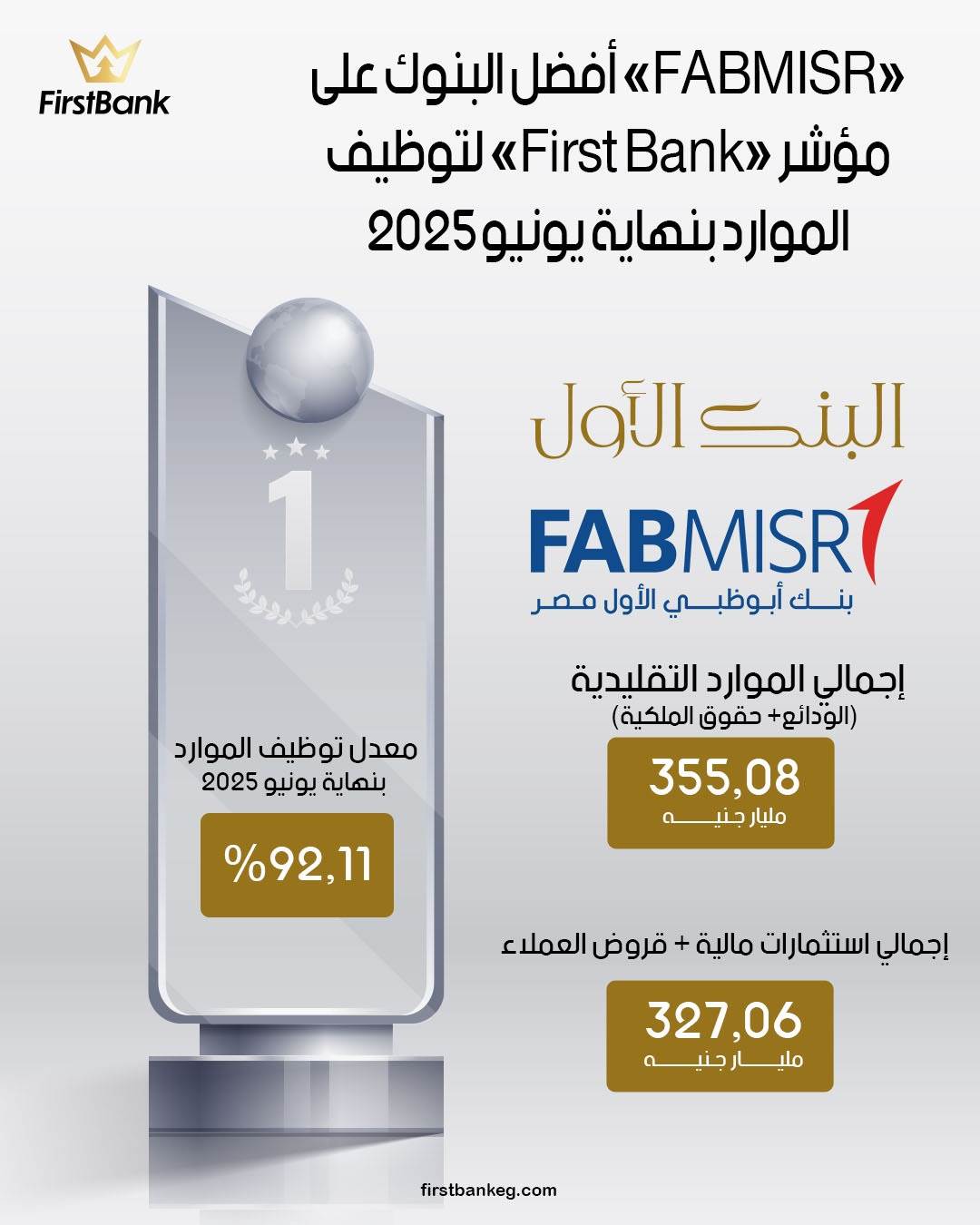ودفع هذا الأداء القوي إلى تصدر «FABMISR» لمؤشر «First Bank» لأفضل البنوك في معدل توظيف الموارد بنهاية يونيو 2025.