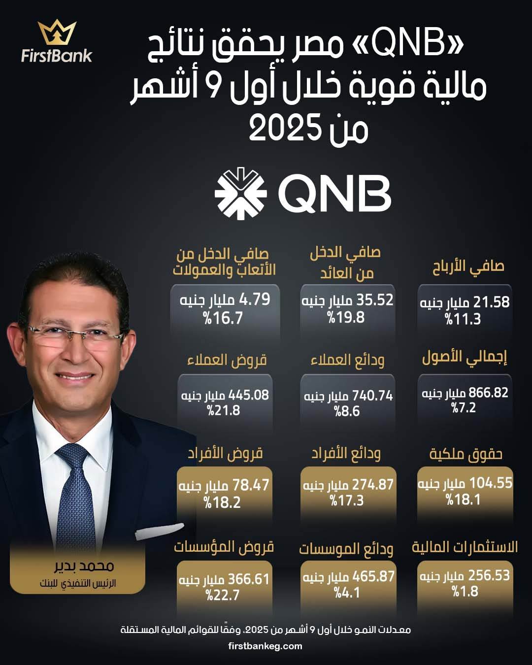 38867 /38867 «QNB» مصر يحقق نتائج مالية قوية خلال أول 9 أشهر من 2025 First Bank 12:06 م - الأربعاء 8 أكتوبر 2025 شارك شارك