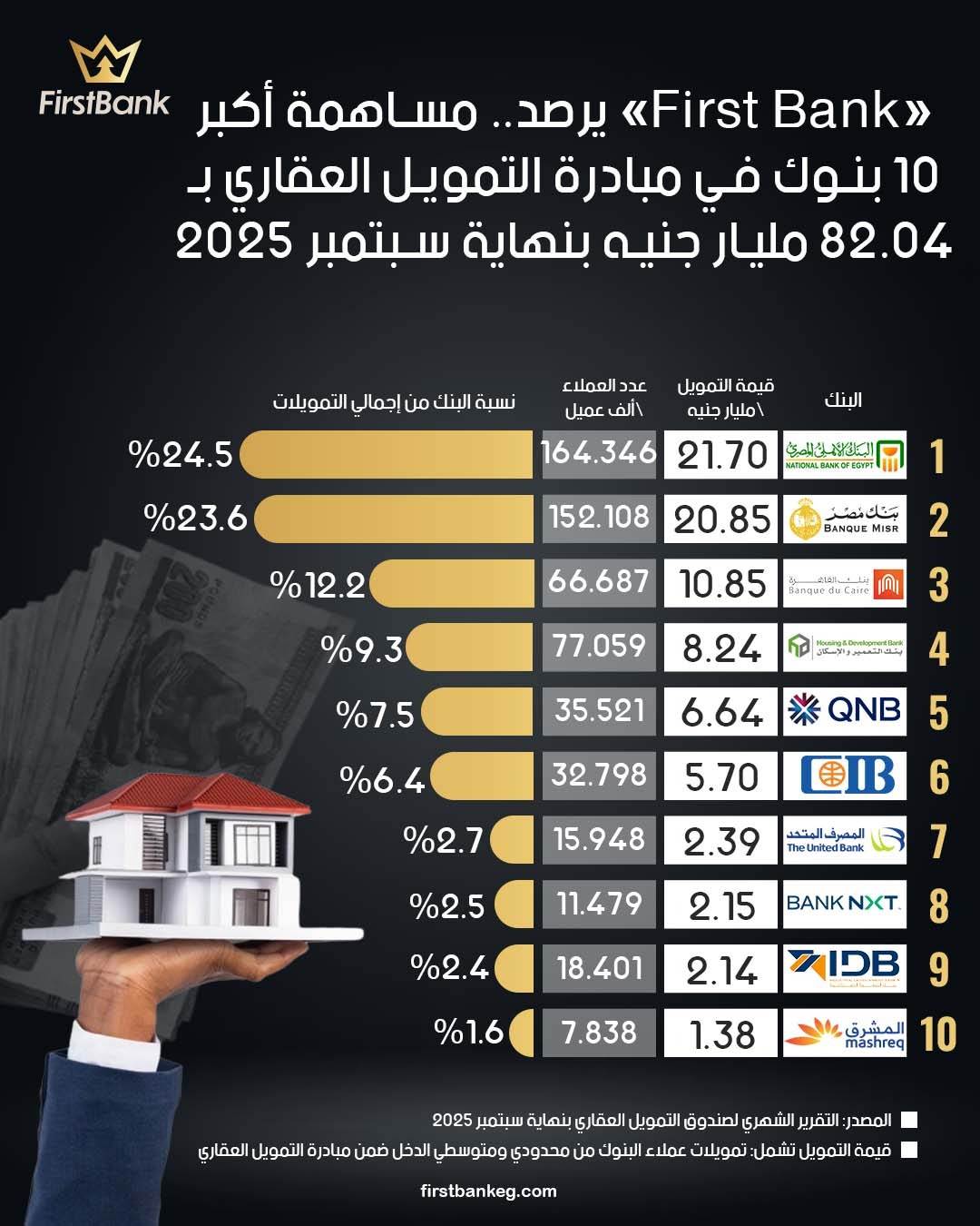 38901 /38901 «First Bank» يرصد .. مساهمة أكبر 10 بنوك في مبادرة التمويل العقاري ب82.04 مليار جنيه بنهاية سبتمبر 2025 First Bank 05:55 م - الأربعاء 8 أكتوبر 2025 شارك شارك