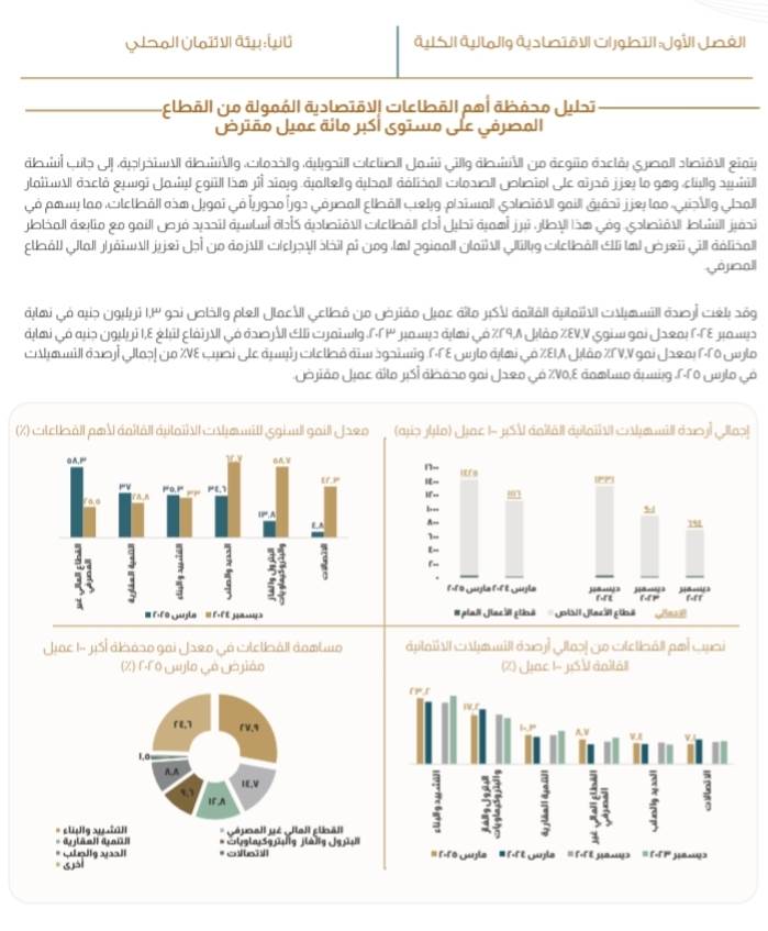 وأوضح التقرير أن هناك 6 قطاعات رئيسية استحوذت على نصيب 74% من إجمالي أرصدة التسهيلات في مارس 2025، وبنسبة مساهمة 75.4% في معدل نمو محفظة أكبر 100 عميل مقترض.