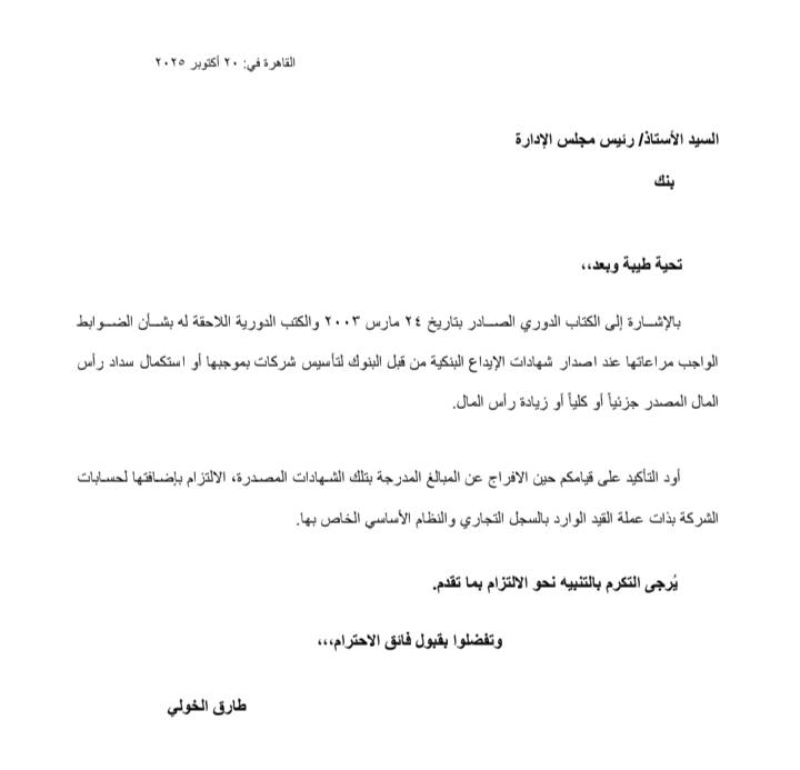 أصدر البنك المركزي المصري كتابًا دوريًا جديدًا بتاريخ 20 أكتوبر 2025، بشأن الضوابط الواجب مراعاتها عند إصدار شهادات الإيداع البنكية من قبل البنوك لتأسيس شركات بموجبها أو استكمال سداد رأس المال المصدر جزئيًا أو كليًا أو زيادة رأس المال.