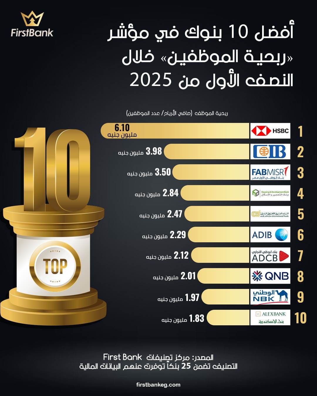 39359 /39359 أفضل 10 بنوك في مؤشر «ربحية الموظفين» خلال النصف الأول 2025 05:55 م - الخميس 23 أكتوبر 2025 شارك شارك