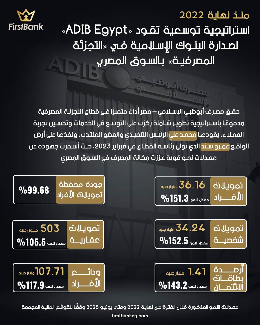 39388 /39388 منذ نهاية 2022.. استراتيجية توسعية تقود «ADIB Egypt» لصدارة البنوك الإسلامية في «التجزئة المصرفية» بالسوق المصري First Bank 02:37 م - الأحد 26 أكتوبر 2025 شارك شارك