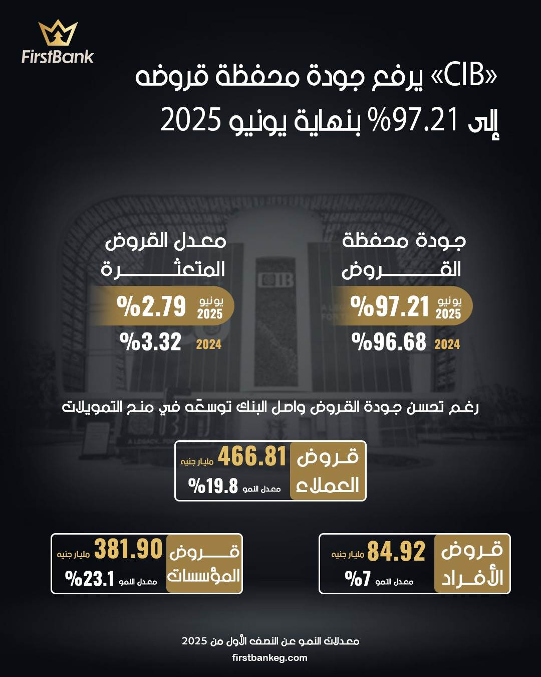 «CIB» يرفع جودة محفظة قروضه إلى 97.21% بنهاية يونيو 2025