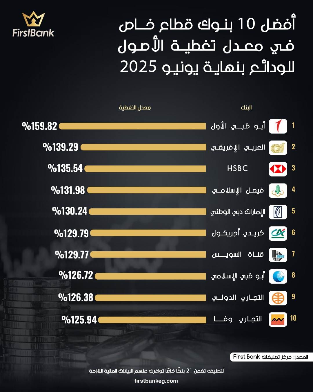 39526 /39526 أفضل 10 بنوك قطاع خاص في معدل تغطية الأصول للودائع بنهاية يونيو 2025 03:05 م - الخميس 30 أكتوبر 2025 شارك شارك