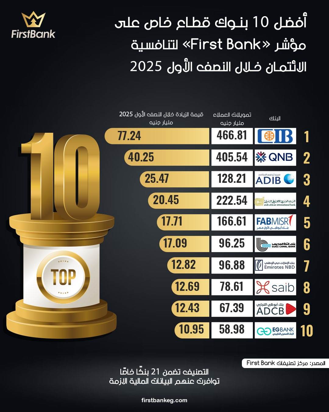39594 /39594 أفضل 10 بنوك قطاع خاص علي مؤشر «First Bank» لتنافسية الائتمان خلال النصف الأول 2025 02:10 م - الأحد 2 نوفمبر 2025 شارك شارك