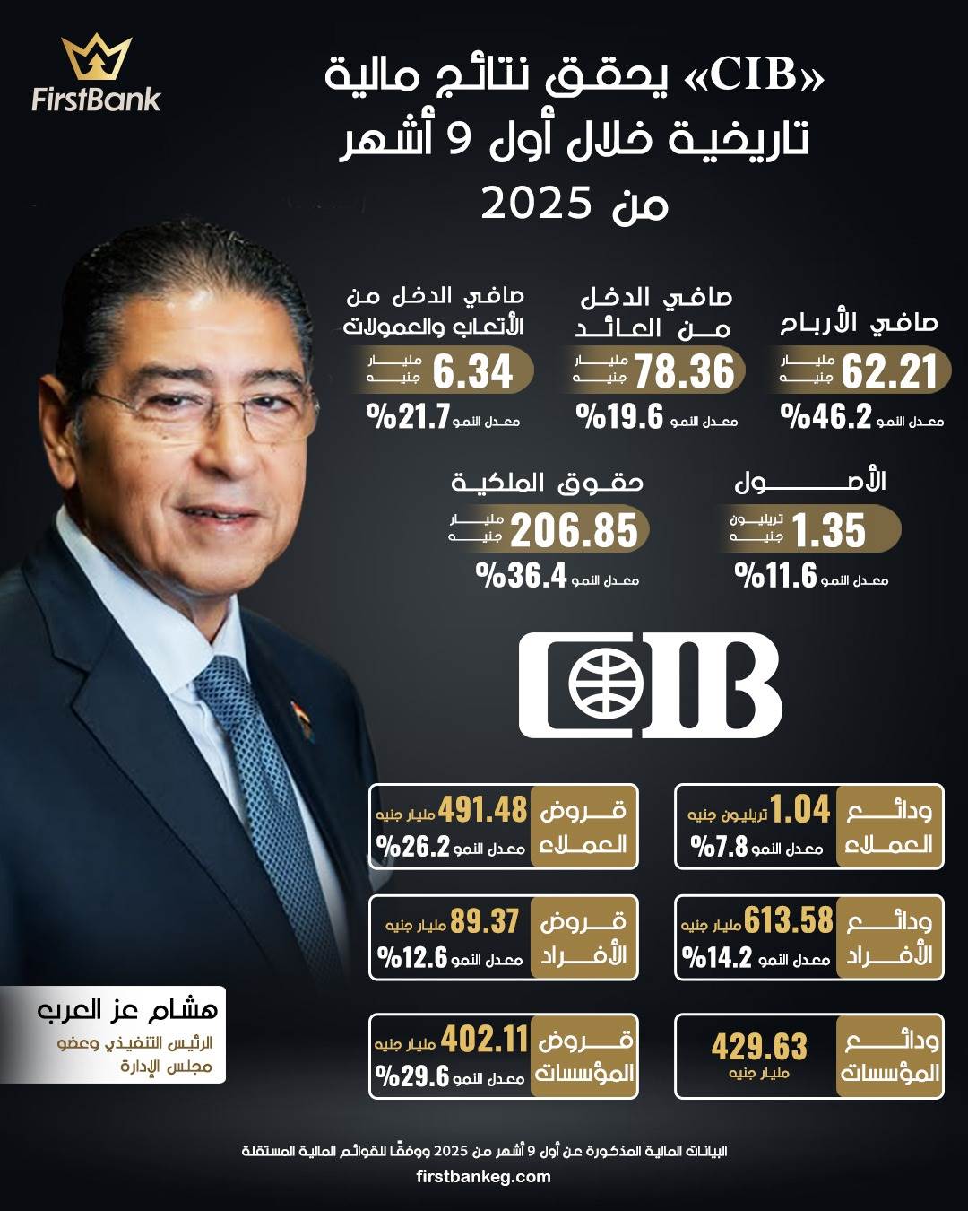 39664 /39664 «CIB» يحقق نتائج مالية تاريخية خلال أول 9 أشهر من 2025 11:51 ص - الثلاثاء 4 نوفمبر 2025 شارك شارك