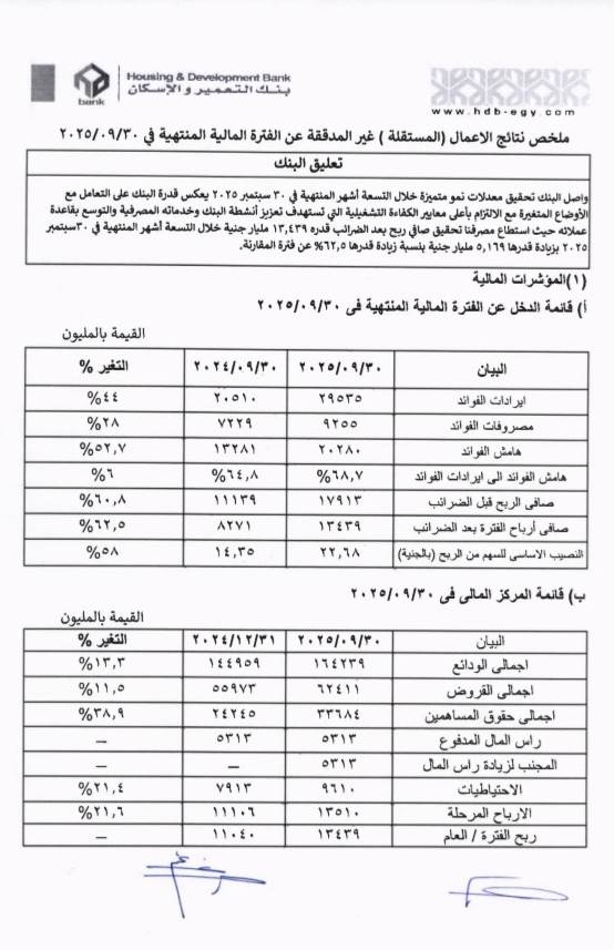 كشفت القوائم المالية المستقلة "الغير مدققة" لبنك التعمير والإسكان، والمنتهية في 30 سبتمبر 2025، عن ارتفاع صافي أرباح البنك بمعدل نمو 62.5%، ليسجل 13.44 مليار جنيه خلال أول 9 أشهر من 2025، مقابل 8.27 مليارًا خلال أول 9 أشهر من 2024، محققًا زيادة بقيمة 5.17 مليار جنيه.