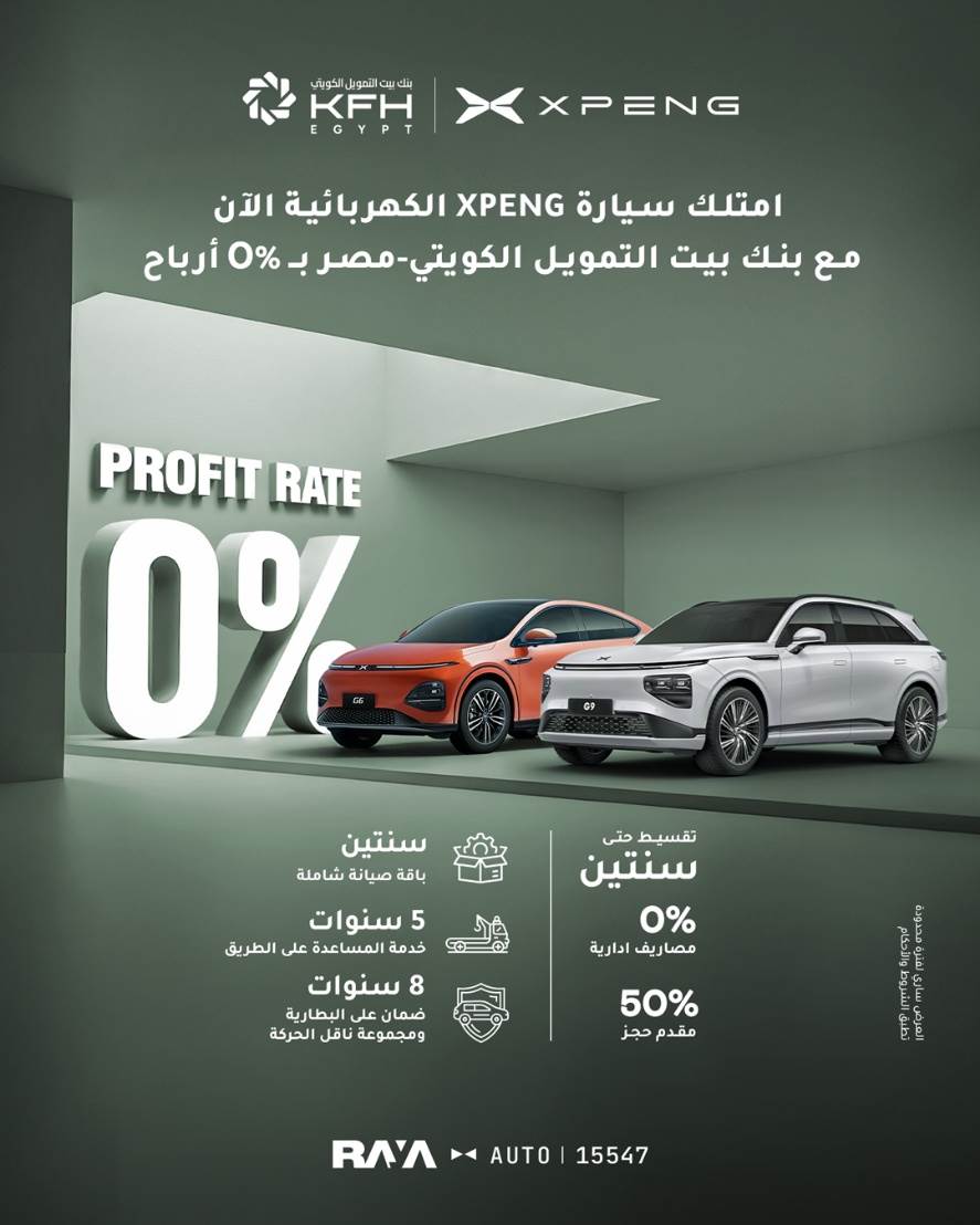 أعلن بنك بيت التمويل الكويتي - مصر عن شراكته مع شركة «Raya Auto» لتقديم عروض تقسيط على سيارات XPENG G9 و G6 بدون أرباح لمدة عامين، وبدون مصاريف إدارية، وخدمة صيانة مجانية لمدة سنتين، ومساعدة على الطريق لمدة 5 سنوات، وضمان لمدة 8 سنوات.