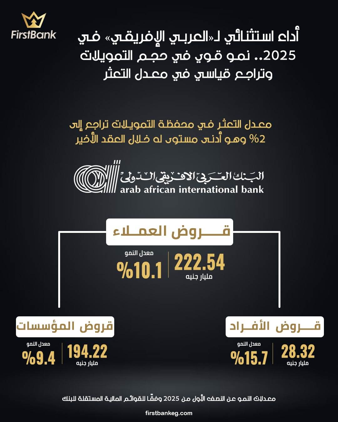 مؤشر «First»: نمو قوي في حجم التمويلات وتراجع قياسي في معدل التعثر.. أداء استثنائي لـ«العربي الإفريقي» في 2025