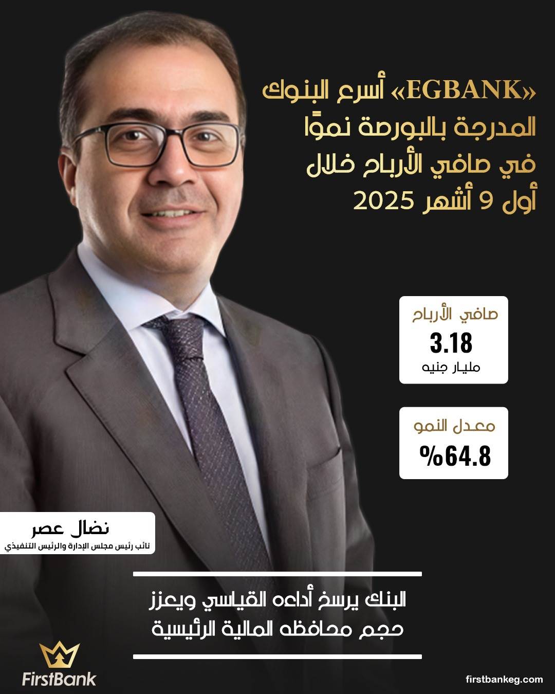 ودفع هذا الأداء القوي للبنك إلى تصدره قائمة «First Bank» للبنوك المدرجة في البورصة المصرية الأسرع نموًا فى صافي الأرباح خلال أول 9 أشهر من 2025.