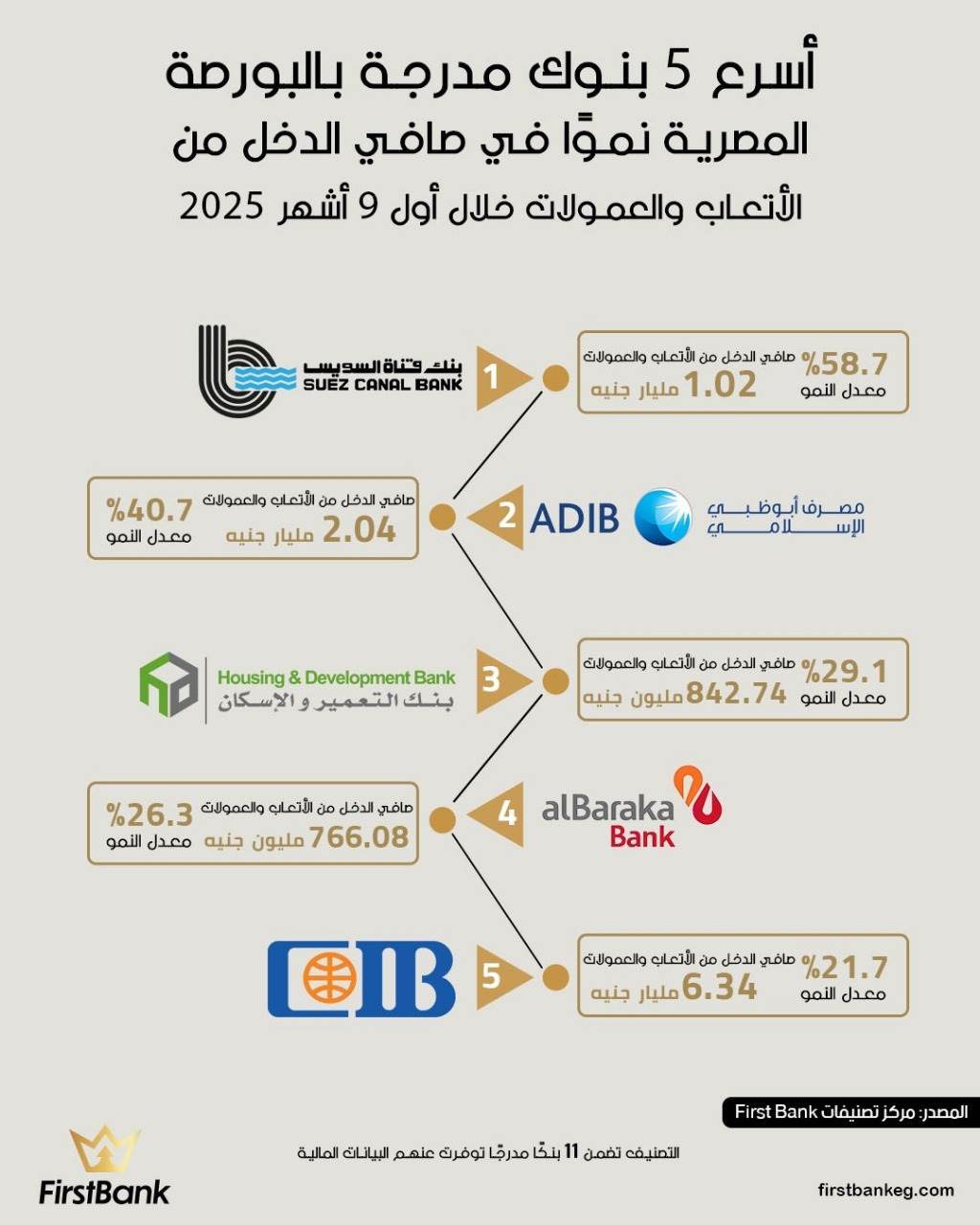 40127 /40127 أسرع 5 بنوك مدرجة بالبورصة المصرية نموًا في صافي الدخل من الأتعاب والعمولات خلال أول 9 أشهر من 2025 01:32 م - الأربعاء 19 نوفمبر 2025 شارك شارك