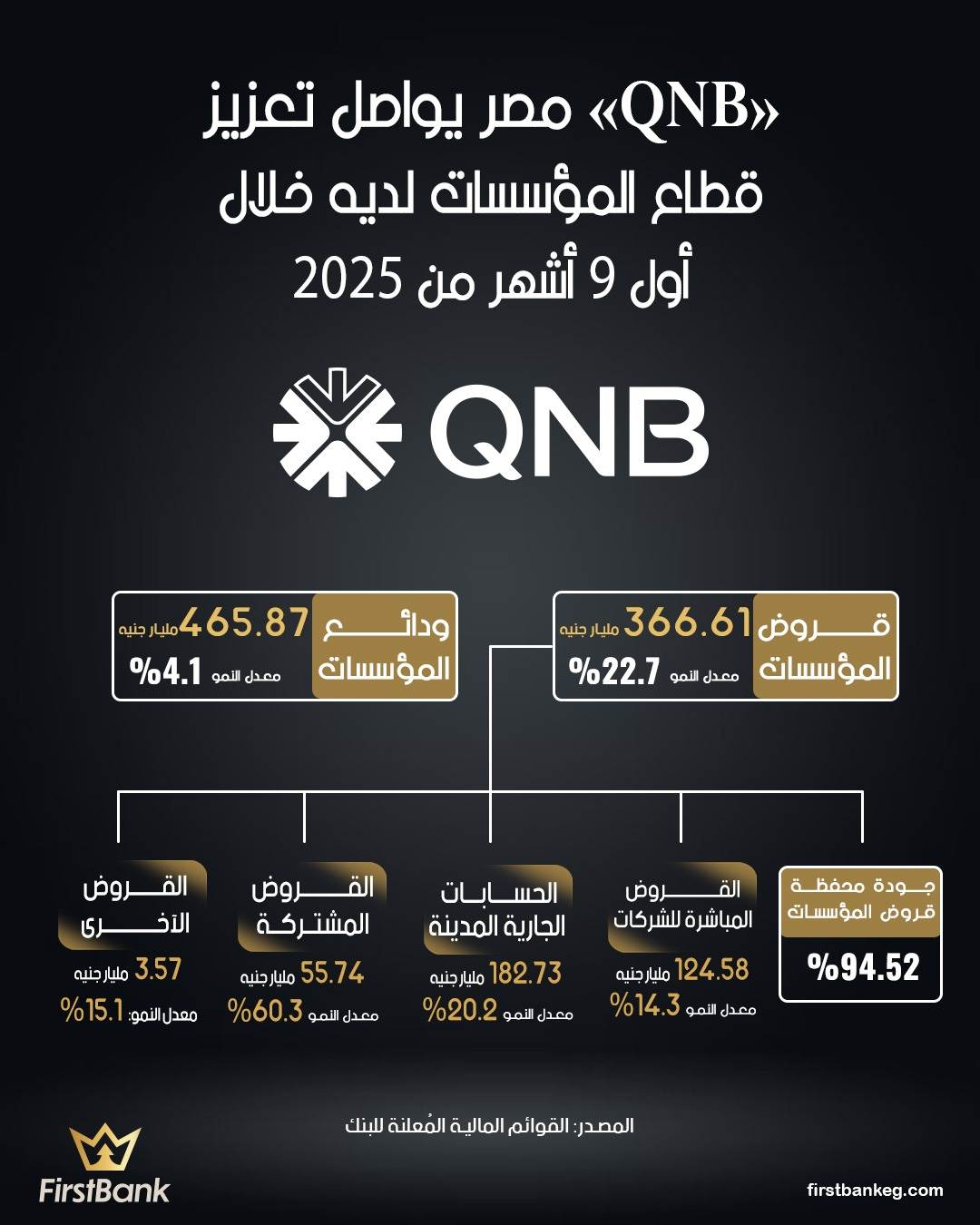 40255 /40255 «QNB» مصر يواصل تعزيز قطاع المؤسسات لديه خلال أول 9 أشهر من 2025 First Bank 11:32 ص - الإثنين 24 نوفمبر 2025 شارك شارك