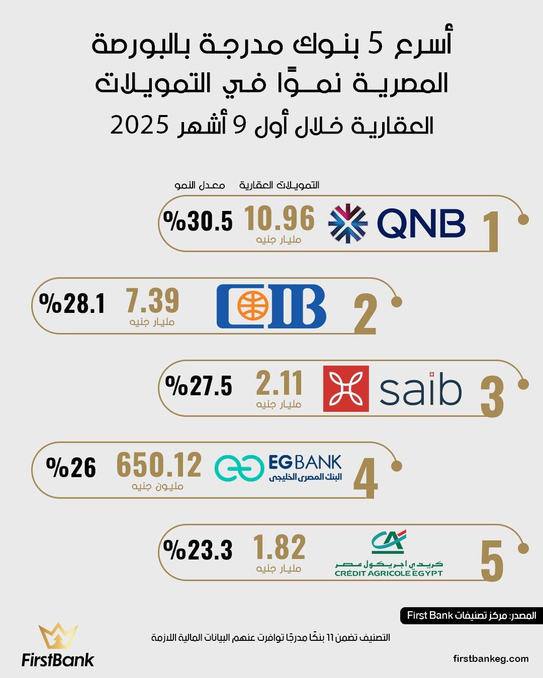 40256 /40256 أسرع 5 بنوك مدرجة بالبورصة المصرية نموًا في التمويلات العقارية خلال أول 9 أشهر 2025 First Bank 12:04 م - الإثنين 24 نوفمبر 2025 شارك شارك