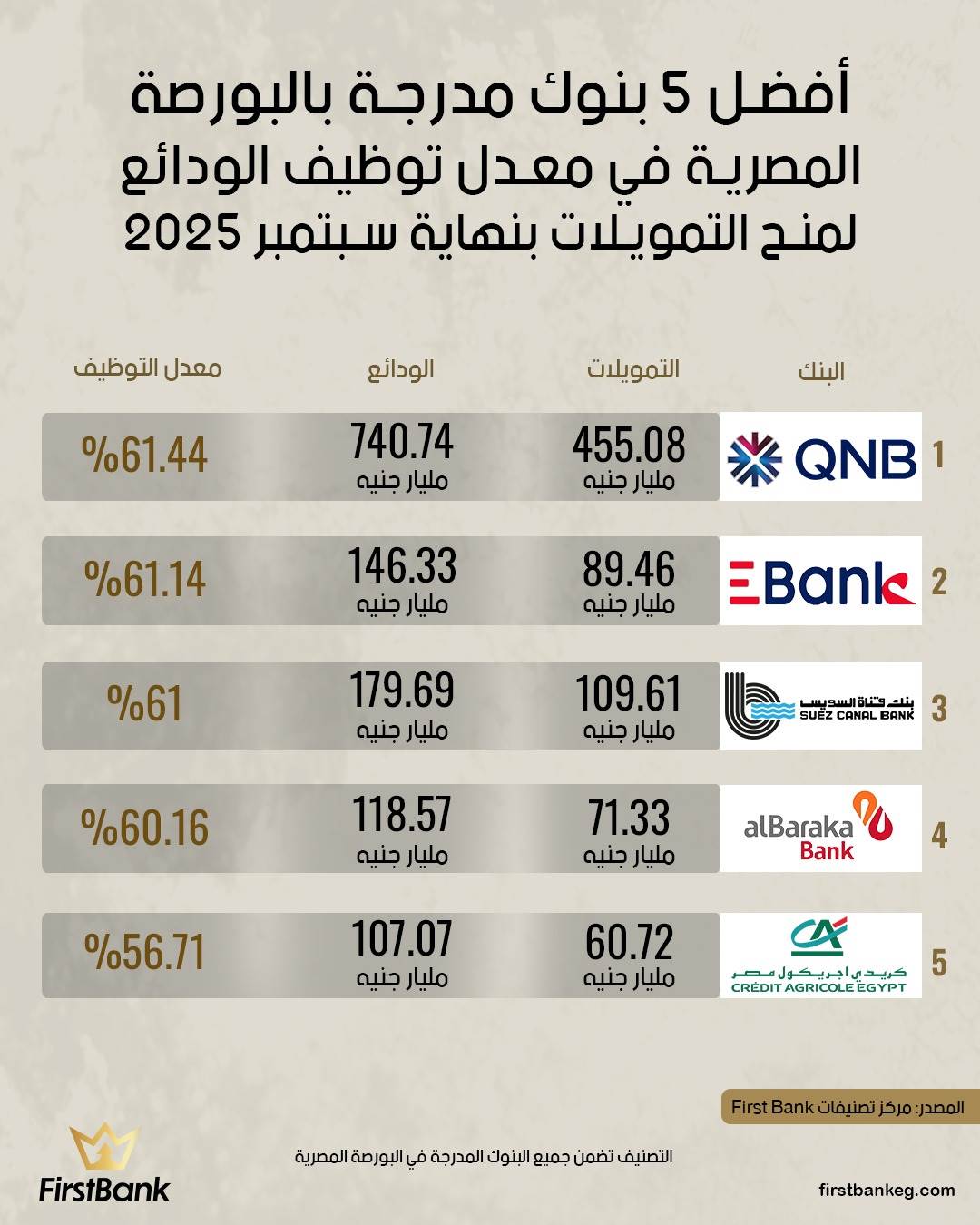 40269 /40269 أفضل 5 بنوك مدرجة بالبورصة المصرية في معدل توظيف الودائع لمنح التمويلات بنهاية سبتمبر 2025 04:03 م - الإثنين 24 نوفمبر 2025 شارك شارك