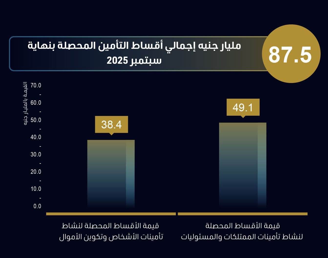 أظهرت أحدث التقارير الصادرة من الهيئة العامة للرقابة المالية عن الفترة بين شهري يناير وحتى سبتمبر لعام 2025 بالنسبة لقطاع التأمين أن قيمة إجمالي أقساط التأمين 87.5 مليار جنيه، حيث بلغت قيمة الأقساط المحصلة لنشاط التأمينات الممتلكات والمسئوليات 49.1 مليار جنيه، فيما سجلت قيمة الأقساط المحصلة لنشاط تأمينات الأشخاص وتكوين الأموال 38.4 مليار جنيه بين شهري يناير وحتى نهاية سبتمبر 2025.