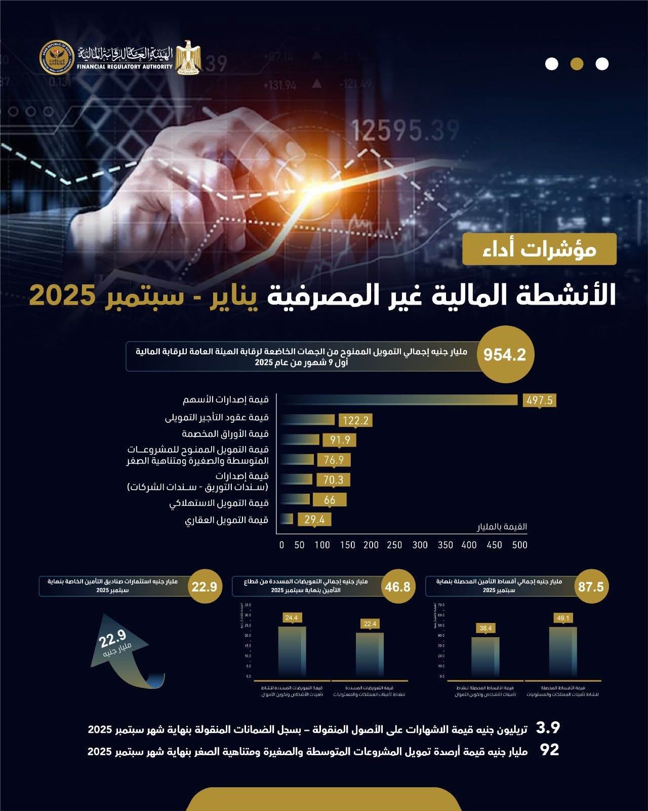 أظهرت أحدث التقارير الصادرة من الهيئة العامة للرقابة المالية، أن إجمالي التمويل الممنوح من خلال الجهات الخاضعة لرقابة الهيئة (أنشطة سوق رأس المال، أنشطة التمويل غير المصرفي) بلغ قيمته 954.2 مليار جنيه خلال الفترة من يناير إلى سبتمبر 2025 وهي 497.5 مليار جنيه قيمة إصدارات الأسهم، 70.3 مليار جنيه قيمة إصدارات الأوراق المالية بخلاف الأسهم.