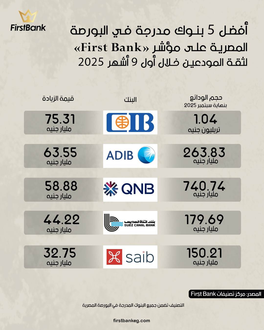 40479 /40479 أفضل 5 بنوك مدرجة في البورصة المصرية على مؤشر «First Bank» لثقة المودعين خلال أول 9 أشهر 2025 First Bank 01:55 م - الثلاثاء 2 ديسمبر 2025 شارك شارك