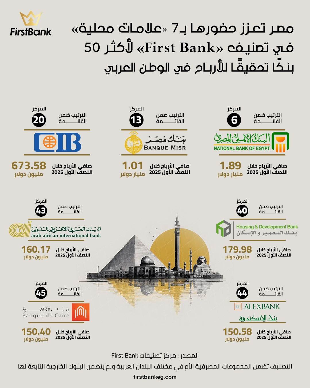 40492 /40492 مصر تعزز حضورها بـ7 «علامات محلية» في تصنيف «First Bank» لأكثر 50 بنكاً تحقيقاً للأرباح في الوطن العربي First Bank 05:03 م - الثلاثاء 2 ديسمبر 2025 شارك شارك