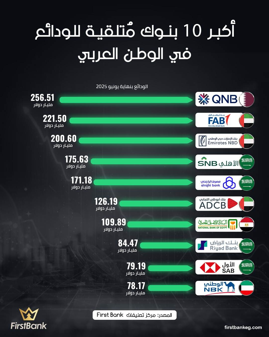 40600 /40600 أكبر 10 بنوك مُتلقية للودائع في الوطن العربي First Bank 03:29 م - الأحد 7 ديسمبر 2025 شارك شارك