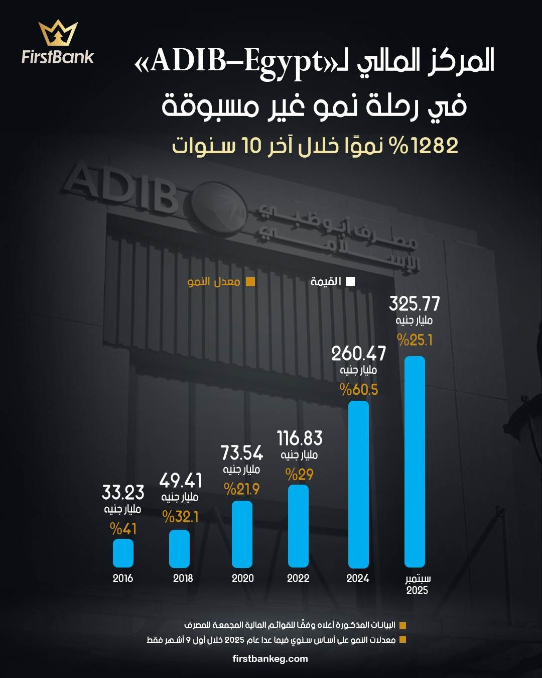 مؤشر «First»: بزيادة 1282%.. المركز المالي لـ«ADIB–Egypt» في رحلة نمو غير مسبوقة خلال العقد الأخير
