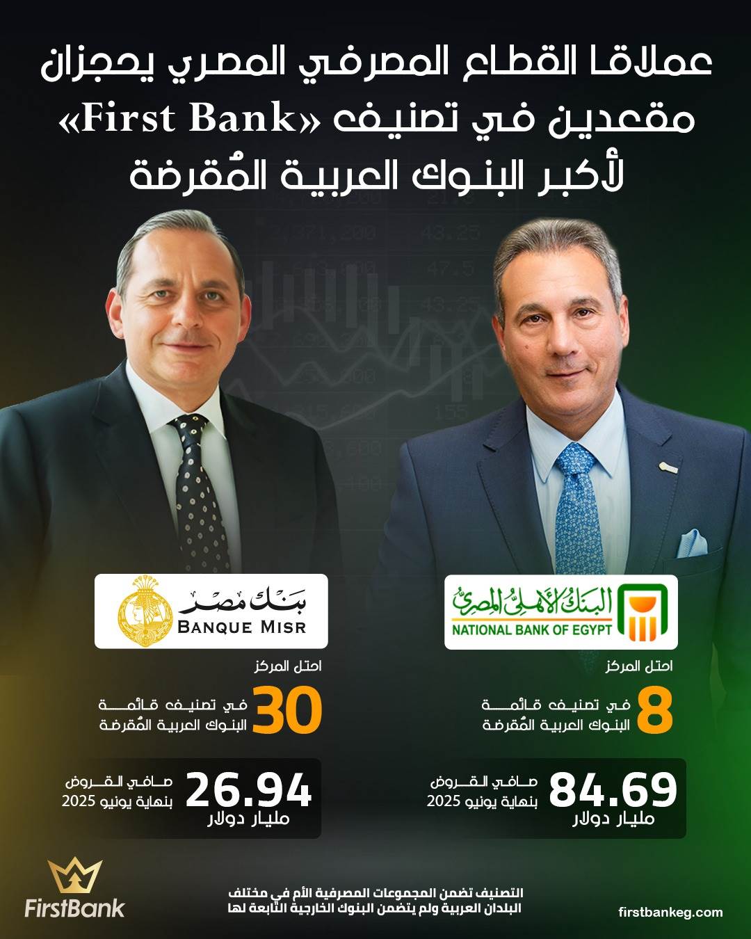عملاقا القطاع المصرفي المصري يحجزان مقعدين في تصنيف «First Bank» لأكبر البنوك العربية المُقرضة