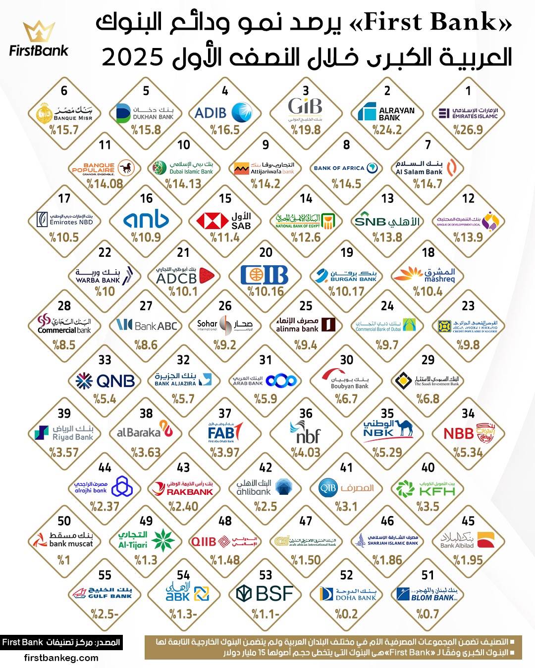40960 /40960 «First Bank» يرصد نمو ودائع البنوك العربية الكبرى خلال النصف الأول 2025 First Bank 12:07 م - الأحد 21 ديسمبر 2025 شارك شارك