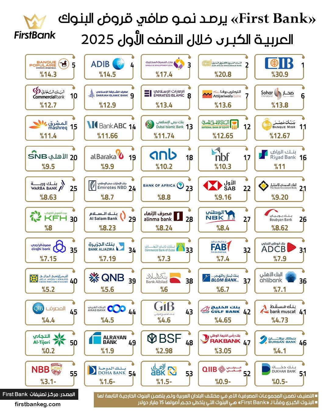41101 /41101 «First Bank» يرصد نمو صافي قروض البنوك العربية الكبرى خلال النصف الأول 2025 04:54 م - الثلاثاء 23 ديسمبر 2025 شارك شارك