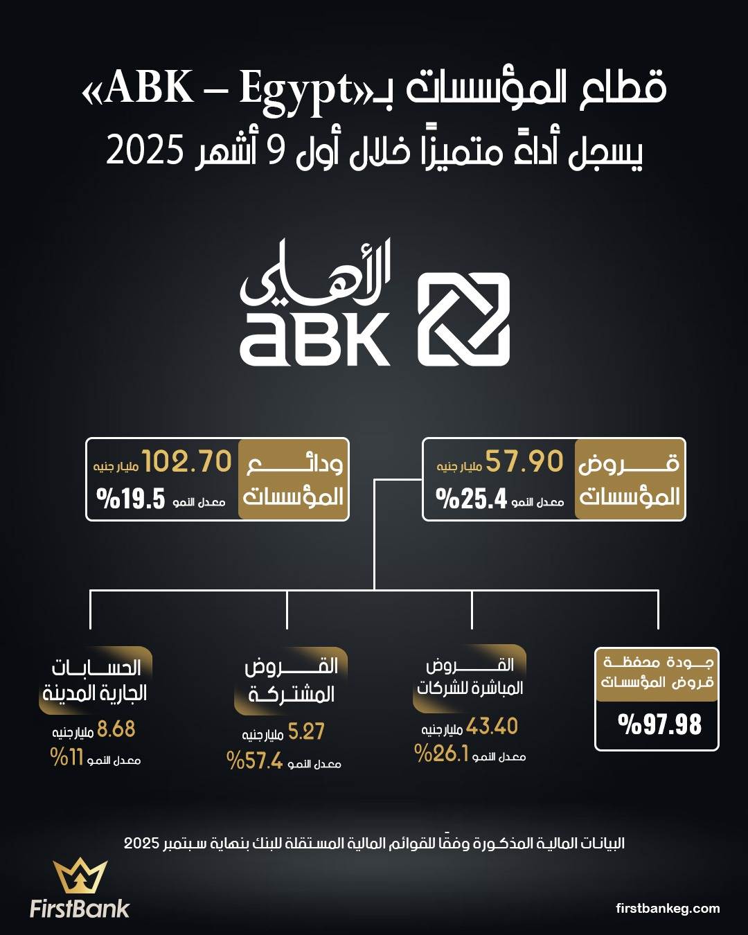 41110 /41110 قطاع المؤسسات بـ«ABK – Egypt» يسجل أداءً متميزًا خلال أول 9 أشهر 2025 01:00 م - الأحد 7 ديسمبر 2025 شارك شارك