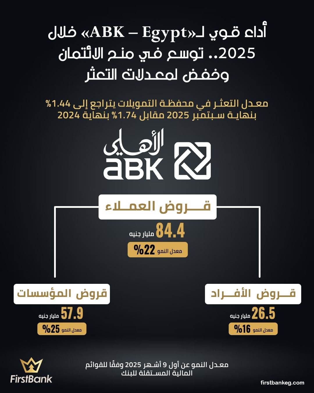 41111 /41111 أداء قوي لـ«ABK – Egypt» خلال 2025.. توسع في منح الائتمان وخفض لمعدلات التعثر 10:17 ص - الثلاثاء 16 ديسمبر 2025 شارك شارك