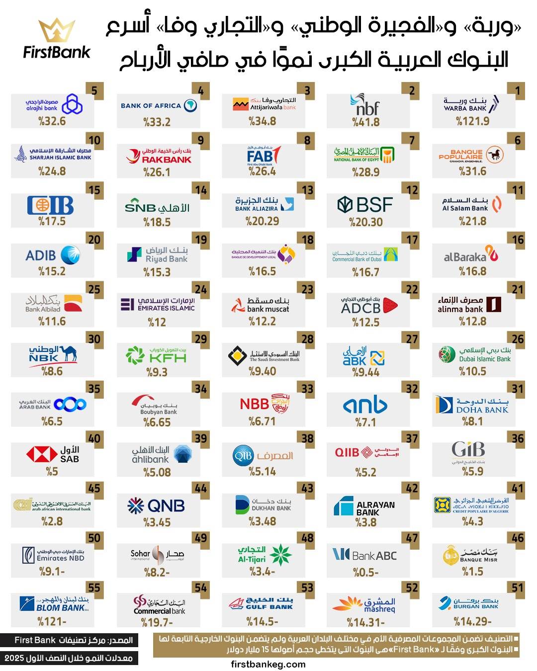 41130 /41130 «وربة» و«الفجيرة الوطني» و«التجاري وفا» أسرع البنوك العربية الكبرى نموًا في صافي الأرباح 04:48 م - الخميس 25 ديسمبر 2025 شارك شارك