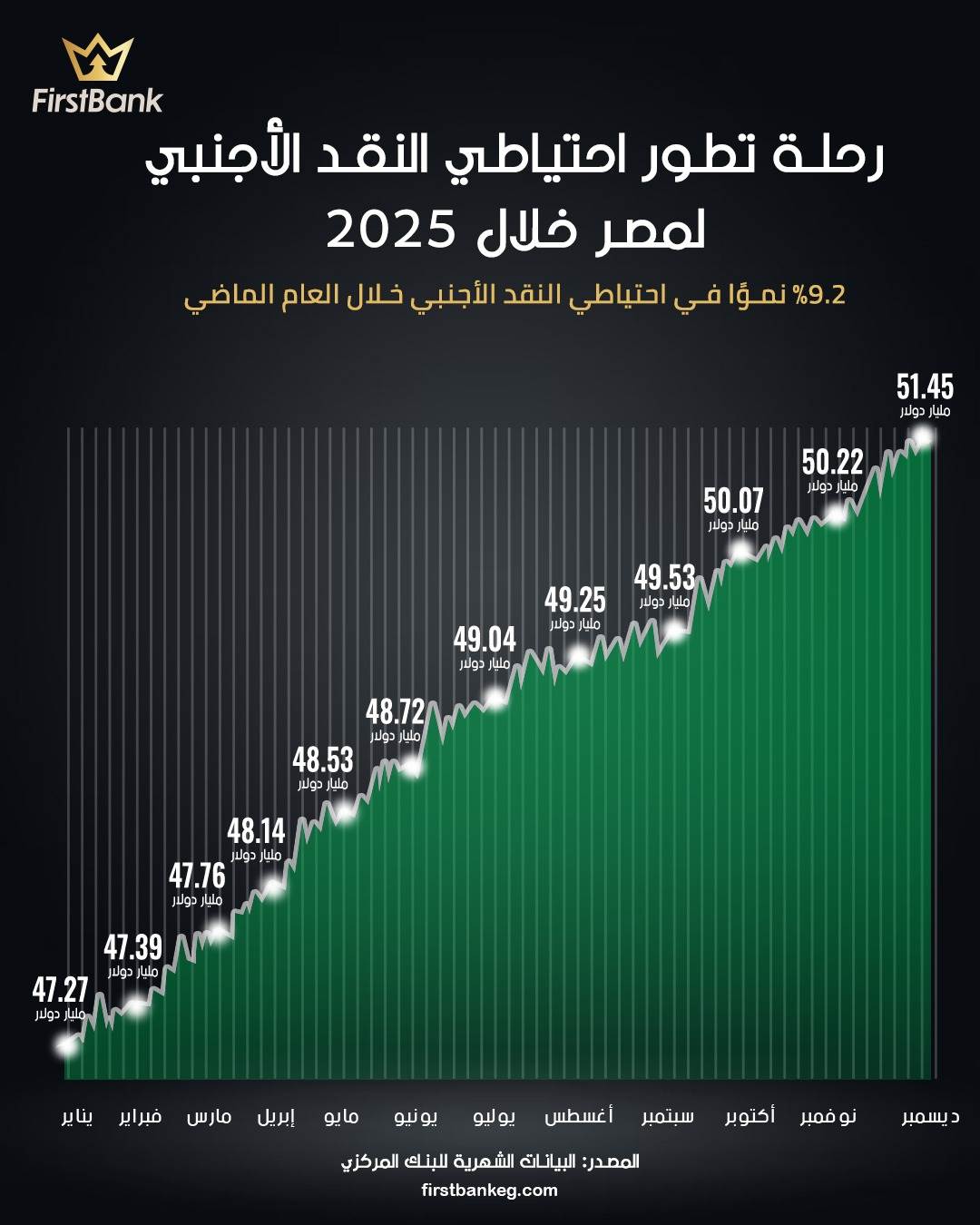 41437 /41437 رحلة تطور احتياطي النقد الأجنبي لمصر خلال 2025 First Bank 04:33 م - الثلاثاء 6 يناير 2026 شارك شارك