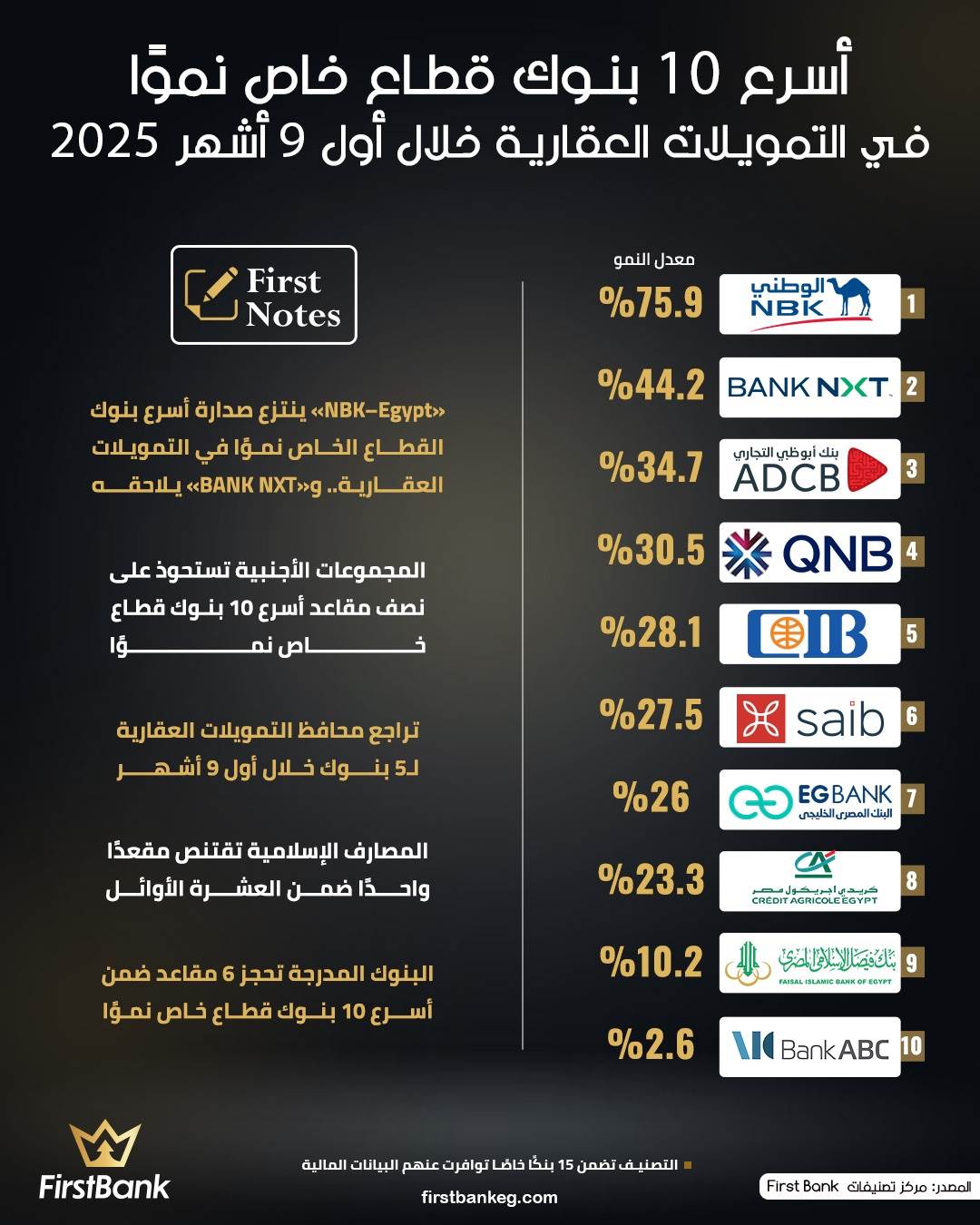 41456 /41456 أسرع 10 بنوك قطاع خاص نموًا في التمويلات العقارية خلال أول 9 أشهر 2025 First Bank 01:09 م - الخميس 8 يناير 2026 شارك شارك