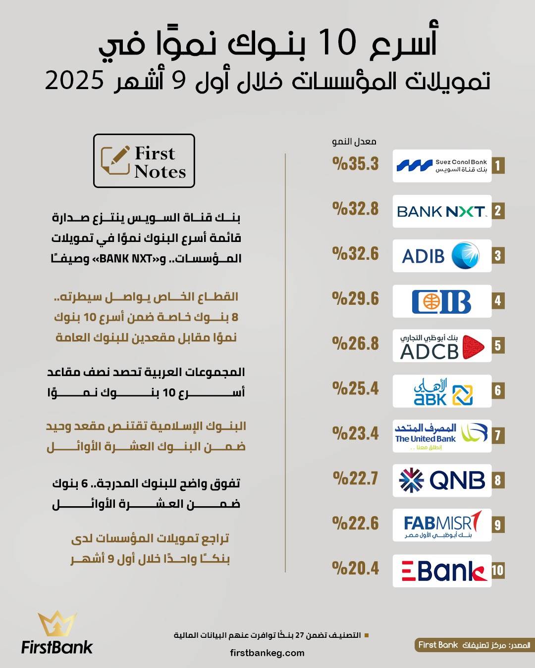 41651 /41651 أسرع 10 بنوك نموًا في تمويلات المؤسسات خلال أول 9 أشهر 2025 First Bank 12:22 م - الأحد 18 يناير 2026 شارك شارك