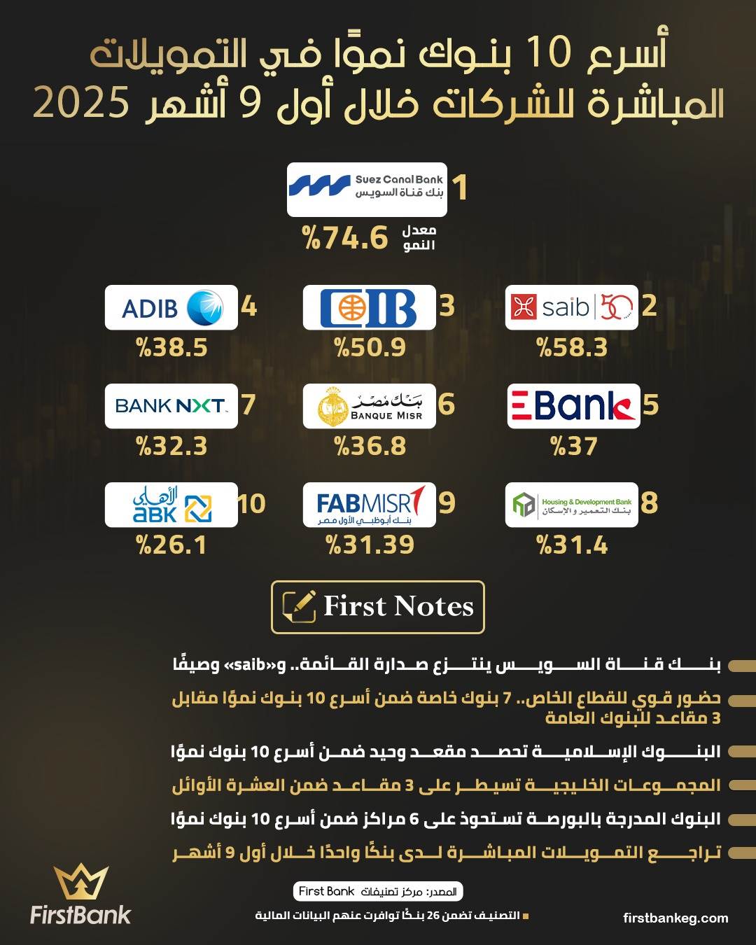 41857 /41857 أسرع 10 بنوك نموًا في التمويلات المباشرة للشركات خلال أول 9 أشهر 2025 First Bank 05:25 م - الإثنين 26 يناير 2026 شارك شارك