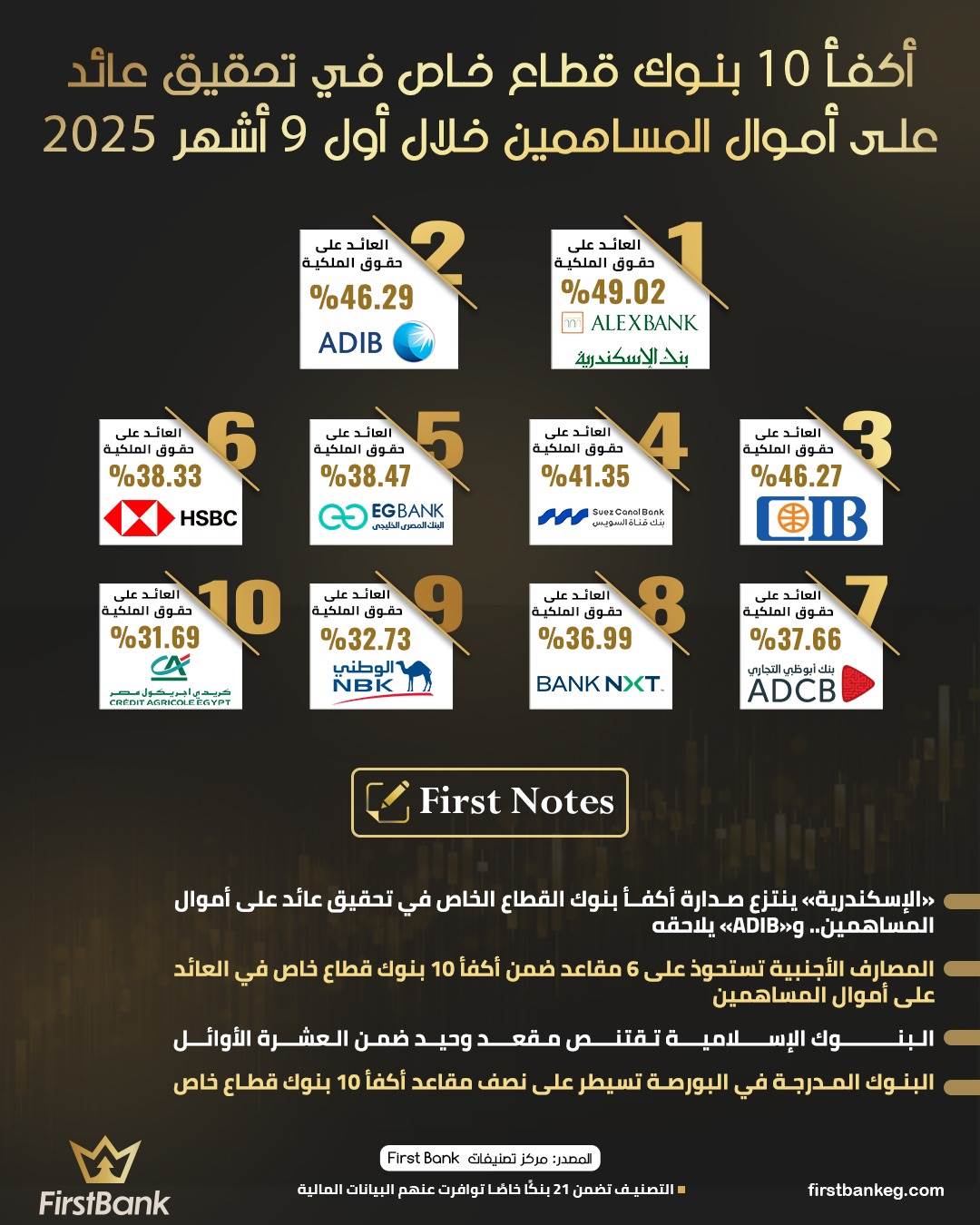 41928 /41928 أكفأ 10 بنوك قطاع خاص في تحقيق عائد على أموال المساهمين خلال أول 9 أشهر 2025 First Bank 10:36 ص - الخميس 29 يناير 2026 شارك شارك